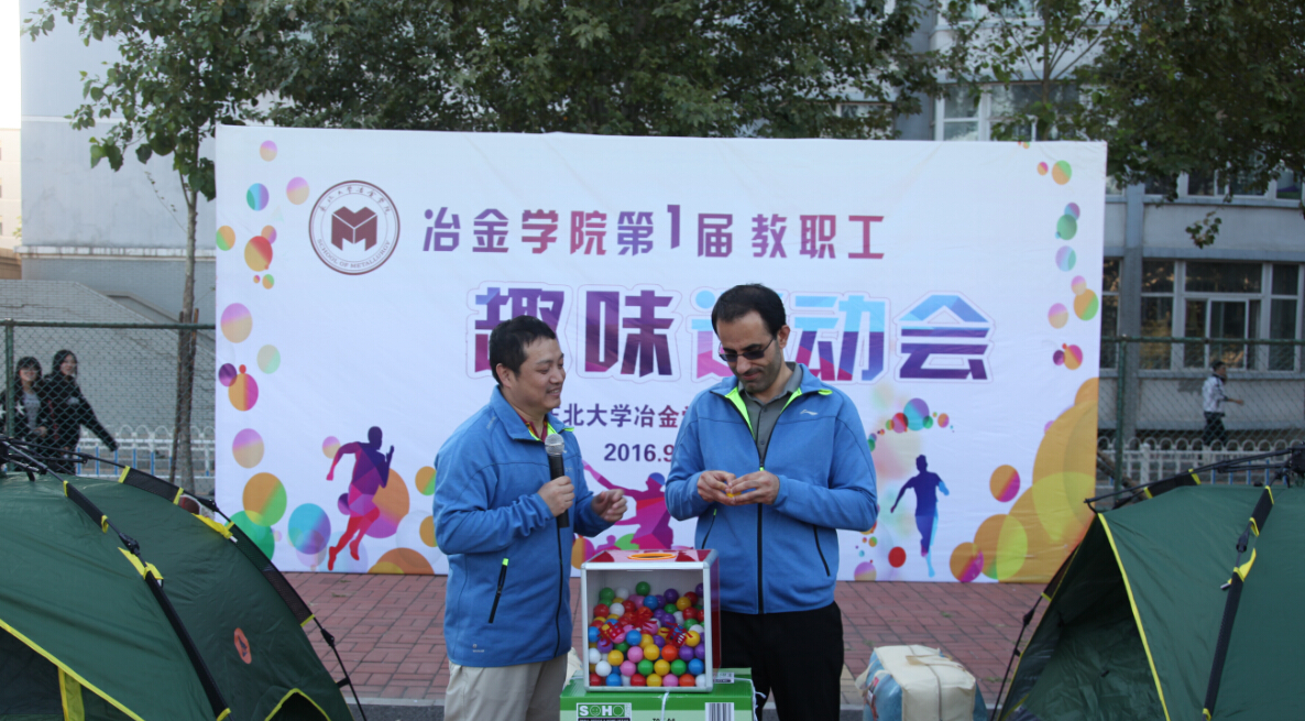 闭幕式上,工会主席谢宏伟宣读了比赛成绩,学院党委书记杨东坪为笃实队颁发了冠军奖牌。随后,进行了激动人心的抽奖环节,学院副院长王梅、吕志娟、重点实验室副主任范柏祥、“双百计划”特聘教授Ali Reza Kamali抽取了四等奖,幸运教工依次抽取了三二一等奖,至此,冶金学院第一届教职工趣味运动会圆满结束。