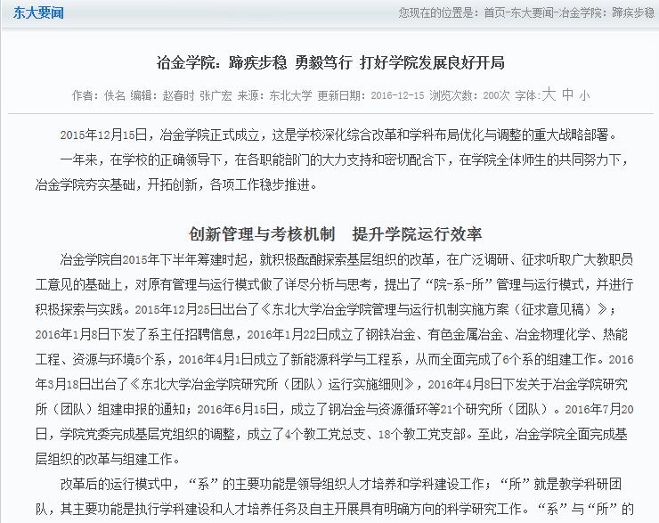 12月15日,是冶金学院成立一周年的日子,学院以多种形式进行庆祝。当天,东北大学校报和东北大学新闻网以《蹄疾步稳,勇毅笃行,打好学院发展良好开局》为题详细报道了冶金学院成立一年来各项工作的推进情况。报道指出:一年的时间里,冶金学院党政领导强化顶层设计,科学谋划,全体师生凝心聚力,开拓创新,围绕学校“双一流”建设,全面深化学院改革,有效破解制约学院和学科发展的难题瓶颈,以坚定改革创新的勇气与魄力,探索出一条符合校情、适应院情、顺应民情的特色之路。