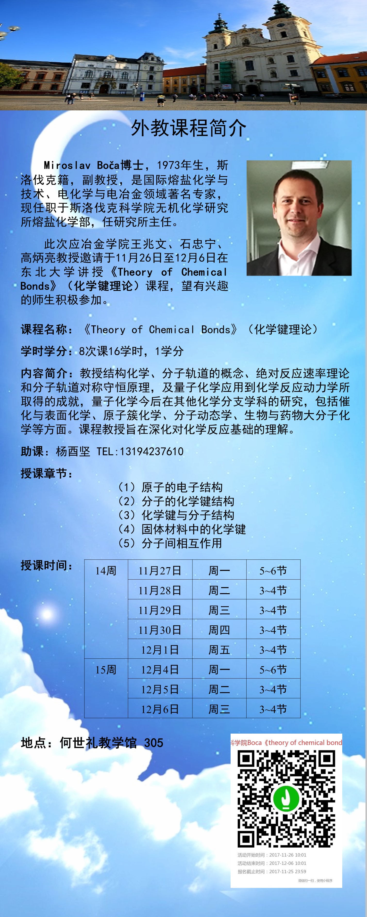 应冶金学院王兆文、石忠宁、高炳亮教授邀请,斯洛伐克科学院无机化学研究所Miroslav Boča博士于11月26日至12月6日在东北大学讲授《Theory of Chemical Bonds》(化学键理论)课程,望有兴趣的师生积极参加。