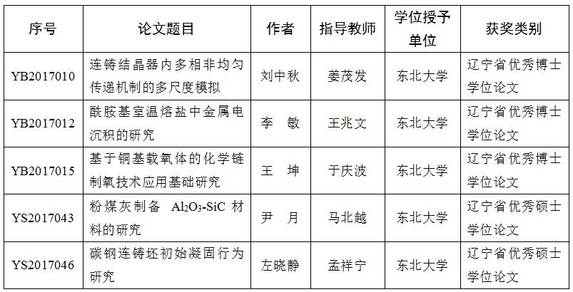 东北大学冶金学院获评2017年辽宁省优秀学位论文清单