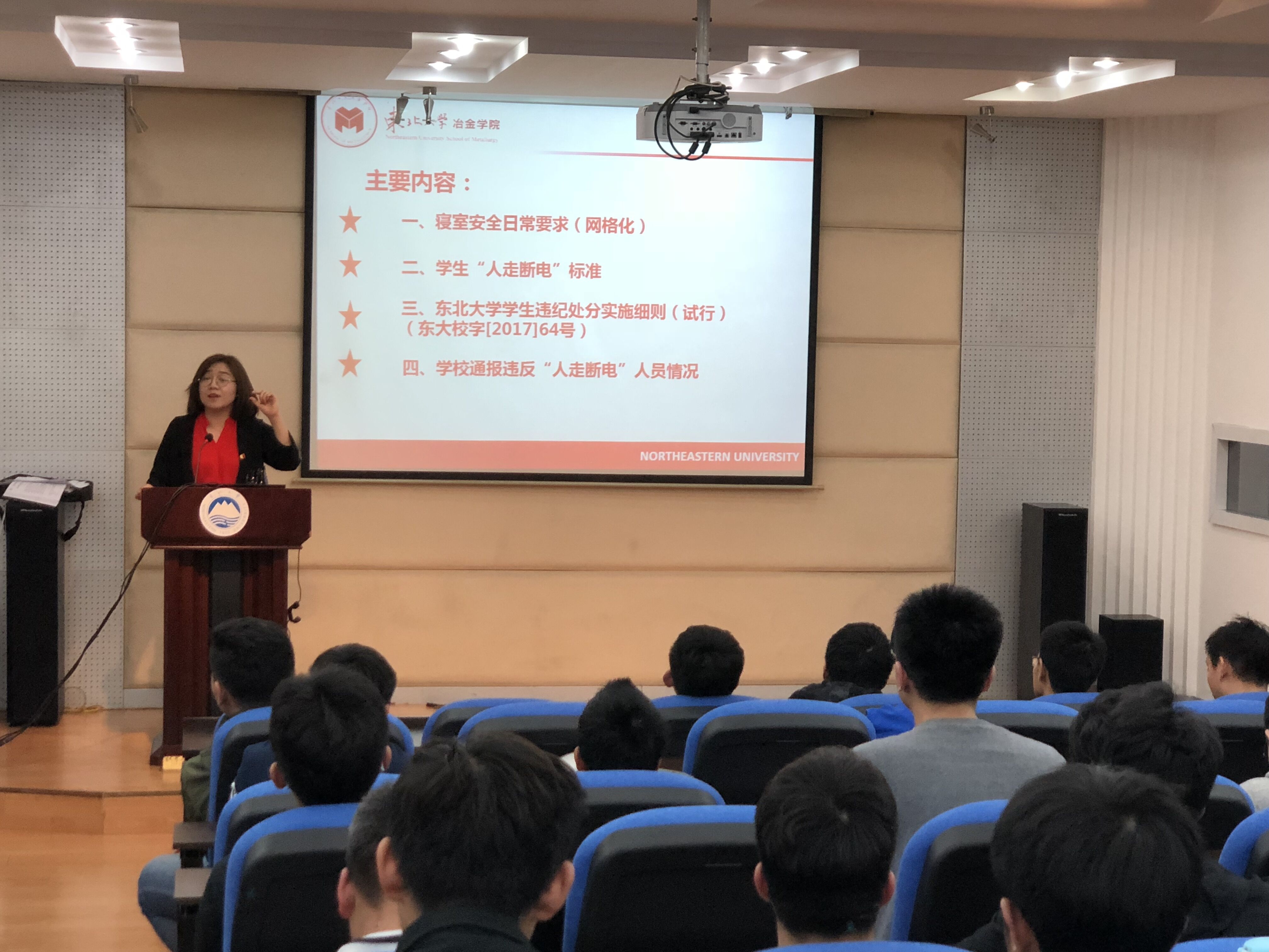 为进一步贯彻落实《关于开展宿舍用电安全专项整治工作的通知》(东大安全字[2017]4号)相关文件精神,有效防止火险火灾事故发生,保障学生生命财产安全,冶金学院于2018年4月19日在大学生活动中心214室召开学生宿舍用电安全教育大会。冶金学院学生工作办公室主任赵冬颖作为主讲人主持会议,各年级辅导员与在近期违反学校宿舍用电安全相关规定的学生参会。