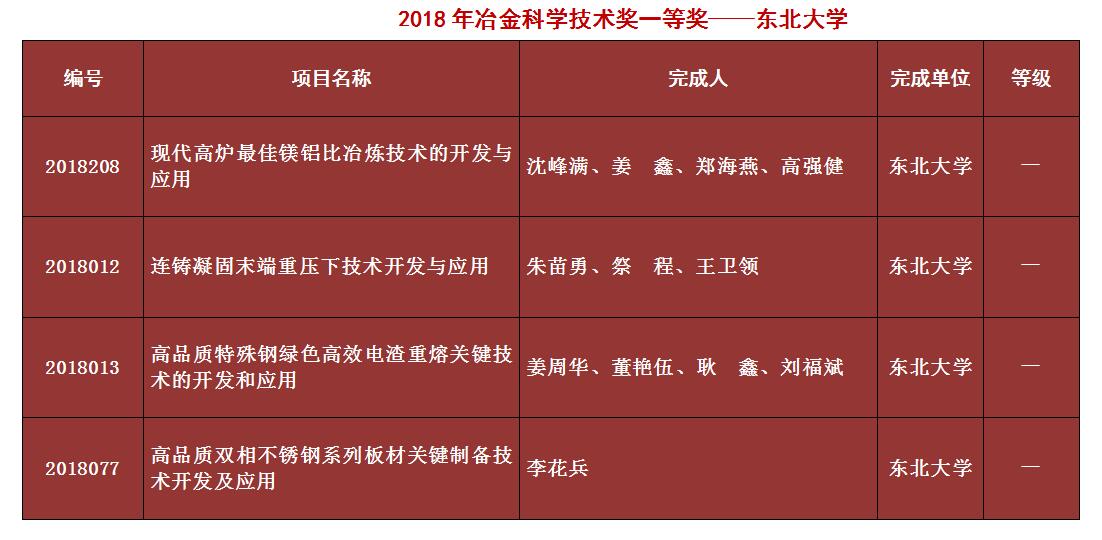日前,2018年中国钢铁工业协会、中国金属学会冶金科学技术奖(简称冶金科学技术奖)专业评审工作已经结束,共推荐获奖项目86项进入公告期(一等奖15项)。东北大学四项成果荣获一等奖,其中,东北大学作为第一完成单位,冶金学院沈峰满教授、朱苗勇教授、姜周华教授牵头的三项成果和李花兵教授参与的一项成果荣获一等奖,实现我校历史性突破,创下冶金高校获奖新纪录。