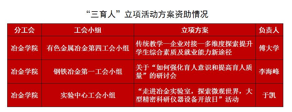 日前,东北大学工会公布了2018年“三育人”立项活动资助情况,2018年全校支持27个小组,冶金学院有三个工会小组“三育人”立项活动方案获得资助,获资助数量位列全校各基层工会之首。具体名单如下: