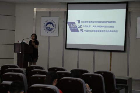 杨丽娟系统阐述了习近平总书记的生态观,梳理了人类文明进步与生态环境之间的关系,以及我国生态环境保护战略提升的宏观路径和实践进程,从产业、消费、城市规划设计和基础设施建设等六个领域努力完成生态文明建设目标。我党进行生态环境保护、生态文明建设的决心不可动摇,勇气势不可挡,坚持生态文明建设方针,认清新时代生态文明建设的形势,展现中华民族的使命担当,为中国经济可持续发展指明道路。于庆波号召师生党员,要将生态环境保护与学科建设和实际工作有机结合,把生态文明建设的任务扛在肩上,记在心里,落实到行动中。