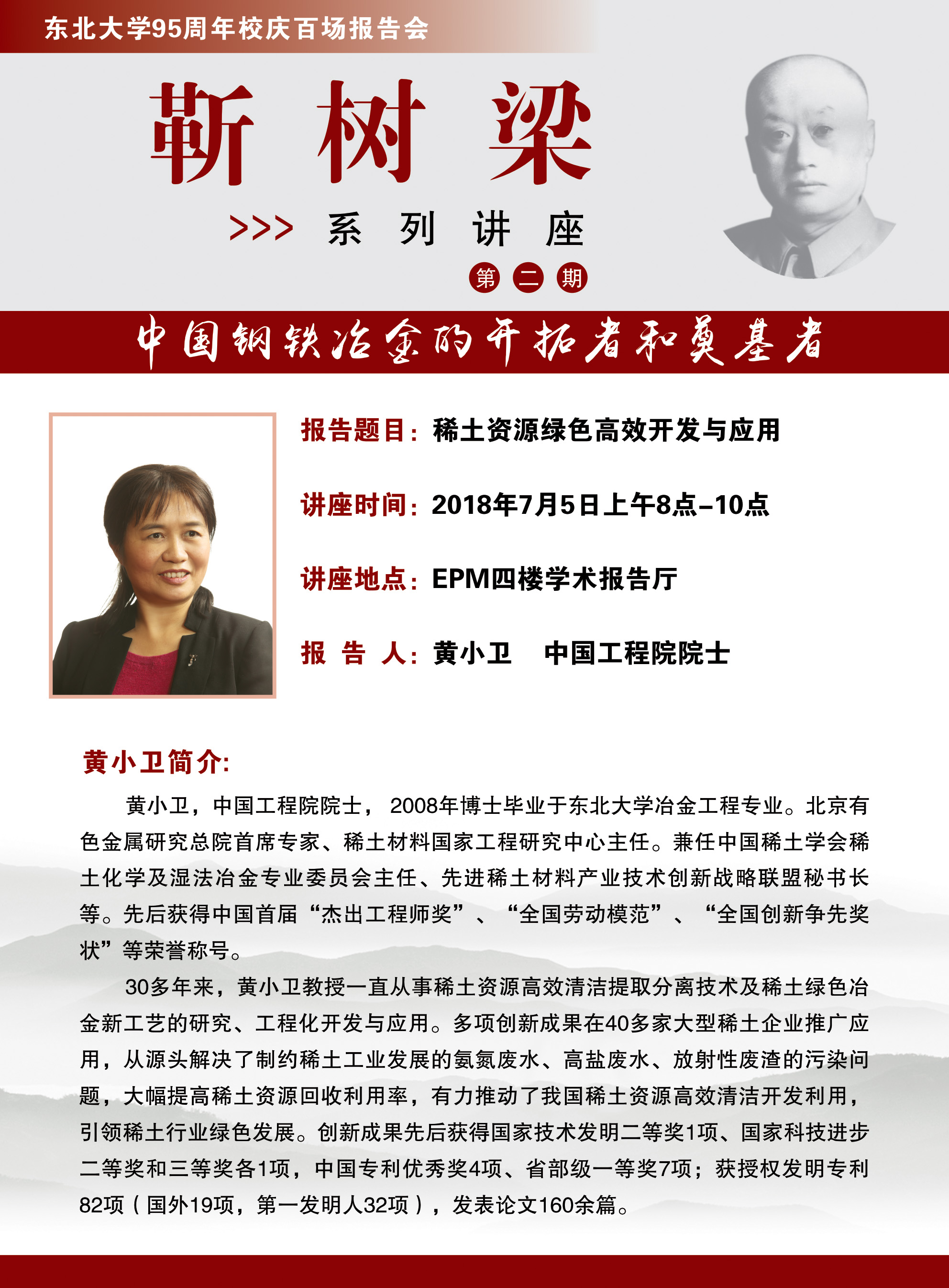应冶金学院资源与环境系薛向欣教授邀请,东北大学冶金工程专业校友、中国工程院院士黄小卫来校做东北大学95周年校庆百场报告会暨“靳树梁讲座”第二期学术报告,欢迎广大师生踊跃参加。