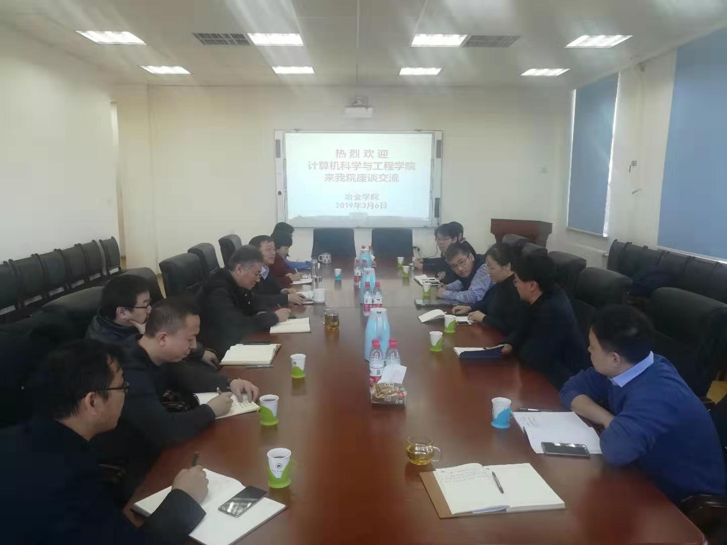 王义表达了此行目的主要是调研冶金学院在人才培养、资源优化配置、团队建设和绩效考核等方面的经验和做法。朱苗勇、杨东坪对计算机学院的到访表示欢迎,结合学院、学科实际情况,向计算机学院介绍了学院近年来的体制机制改革与创新工作,双方重点就人才培养体系改革、资源优化配置、团队建设与考核等方面进行了交流探讨,最后双方表示今后将进一步加强沟通,充分发挥双方特点和优势,进行学科交叉探索,加强合作交流。