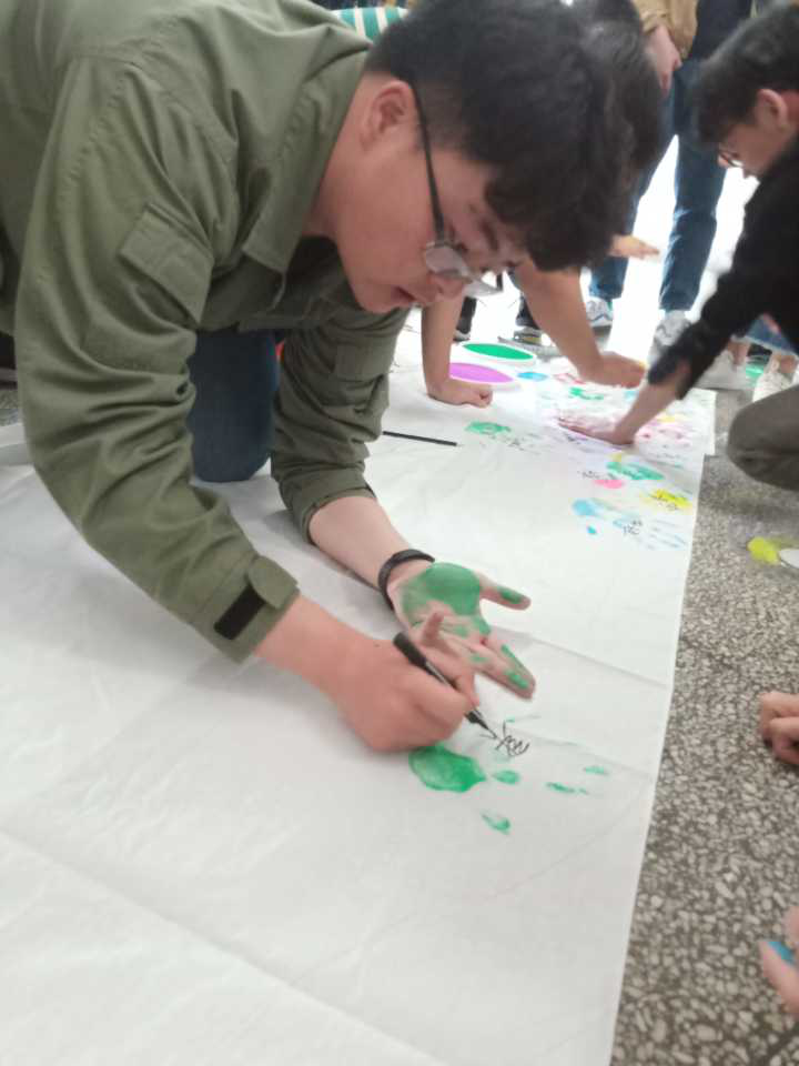 在给学弟学妹留完寄语后,全体党员又以手为笔,共同绘出一株参天大树,开展了“青春留印”活动,寓意着同学们的青春活力、勃勃生机和不忘初心、青春无悔的决心。