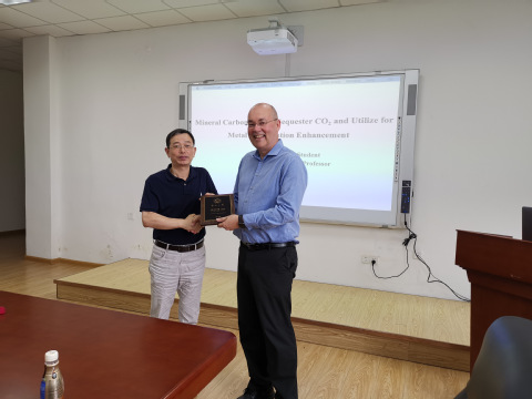 7月17日,加拿大英属哥伦比亚大学David Dreisinger教授做客东北大学“靳树梁讲座”第七期,在冶金馆311B会议室作主题为《利用矿物碳化封存CO2以及增强金属硫化过程的应用(Mineral Carbonation for CO2 Sequestration and Utilization for Metal Sulfidization Enhancement)》的学术报告。David Dreisinger介绍了英属哥伦比亚大学及湿法冶金研究团队的发展历史,深入浅出地讲述了采用选矿废石来固化二氧化碳减少碳排放,同时回收镍钴等有价金属的研究背景、机制以及未来的应用前景。报告后,David Dreisinger与在场师生进行了热烈的互动交流,冶金学院院长朱苗勇向David Dreisinger颁发了东北大学“靳树梁讲座”第七期纪念奖牌。
