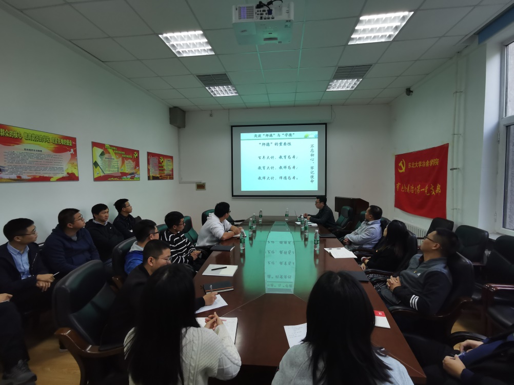 支部书记胡宪伟以《浅谈“师德”与“学德”》为题为支部党员讲了专题党课。胡宪伟首先结合“不忘初心、牢记使命”,讲述了“师德”的重要性;进而从“师德”的概念入手,结合习近平总书记“四有”好老师的标准和要求,从“师业”、“师爱”、“师能”、“师风”四个方面阐述了“师德”的内涵;接着,结合日常学习工作心得,引导教师将“课程思政”与“传道”相结合,在教育过程中,弘扬和传承中华民族传统文化和社会主义先进文化;同时谈了自己对将“思政”相关知识和理念融入到日常教学的几点体会。另一方面,胡宪伟结合自身经历,强调了“学德”建设的重要性,教育支部的教师党员传授文化知识的同时也要加强学生“学德”教育;教育支部的学生党员要明确学生职业要求,遵守纪律,主动钻研,尤其要注重提升自身修养,促进自身全面发展。