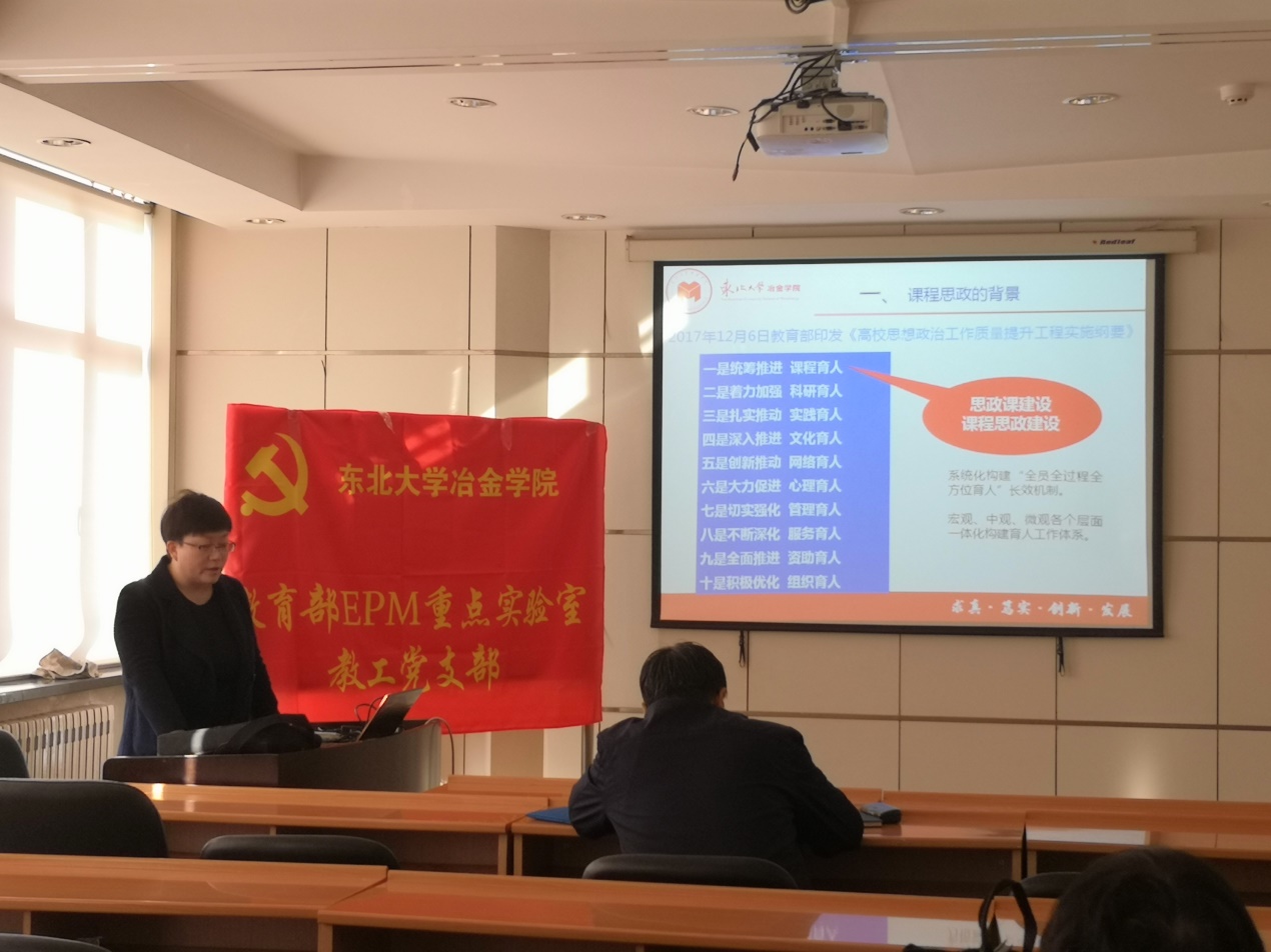 10月30日,教育部EPM重点实验室教工党支部在EPM实验室312会议室开展了“不忘初心、牢记使命”主题教育党课学习。会议由EPM实验室党总支书记范柏祥主持,邀请了冶金学院党委副书记兼副院长吕志娟讲授以“关于‘课程思政’的学习与探讨”为主题的党课。