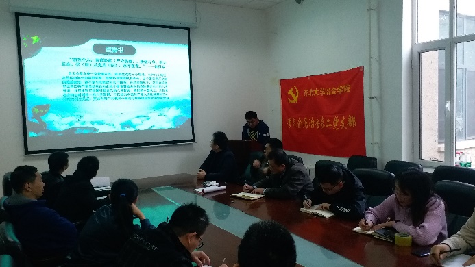 10月24日,有色金属冶金第二党支部在冶金馆310召开党会,集中学习《见证初心和使命的“十一书”》。