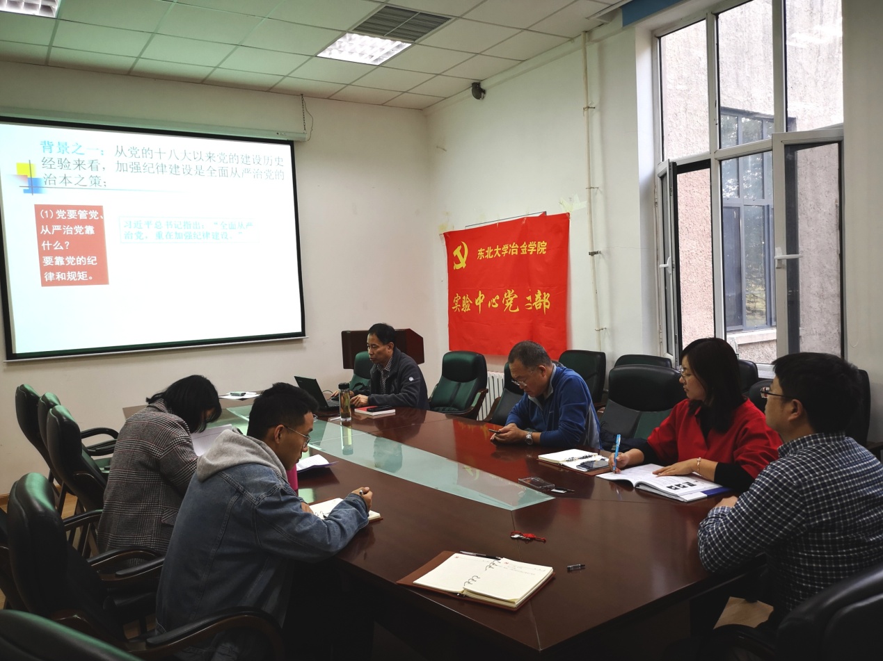 11月6日,冶金学院实验中心党支部支部书记符岩在冶金馆310就新修订《中国共产党纪律处分条例》为支部党员开展了一堂党课学习。