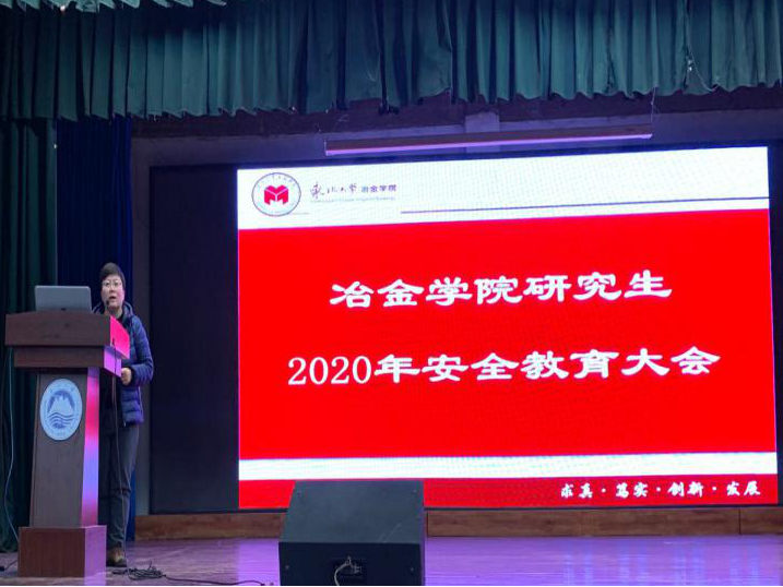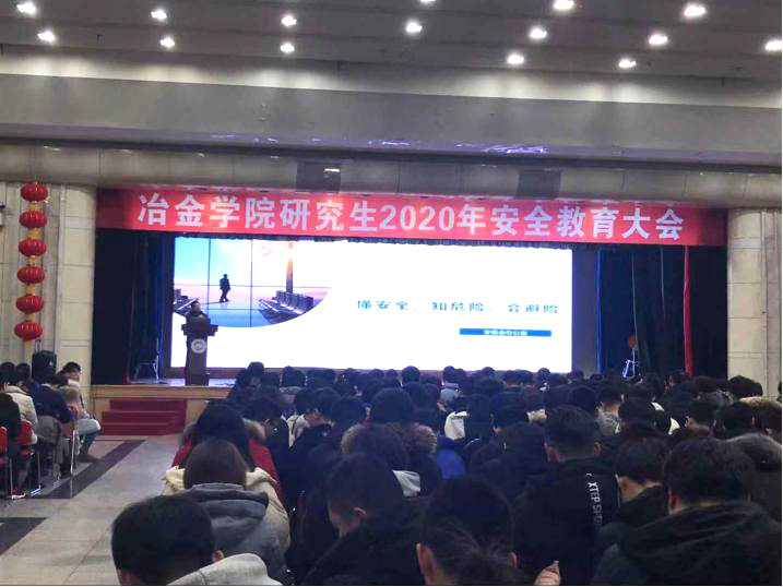 2020年1月8日,冶金学院研究生2020年安全教育大会在学生活动中心多功能厅举行。校安全管理委员会办公室主任尚子扬应邀为学生进行安全教育,冶金学院党委副书记兼副院长吕志娟、多金属共生矿生态化冶金教育部重点实验室安全工作有关同志、研究生辅导员及各年级在校研究生参会。