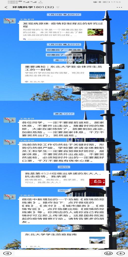 学院全面构建学院、研究所(团队)、实验中心、办公室、党支部、班团、全体师生的多层级防控体系,全员参与,联动联防联控,不落一人、不留死角。建立多类多层工作小组微信群,及时传达学校学院防控工作要求,全面了解师生最新情况,健全完善信息互通、共享机制,督促防控工作落细落实。