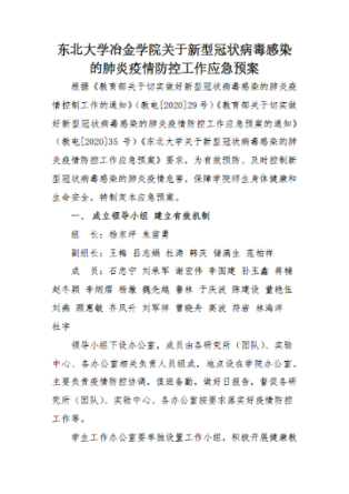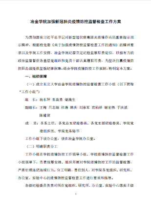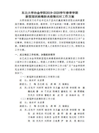 学院党政高度重视,第一时间成立疫情防控工作领导小组和工作小组,书记、院长担任组长,团结带领全院师生群策群力,群防群控。自成立以来,领导小组和工作小组充分发挥核心作用,制定了《冶金学院关于新型冠状病毒感染的肺炎疫情防控工作应急预案》《冶金学院2019-2020学年春季学期新型冠状病毒感染的肺炎疫情应对工作方案》,全体成员明确分工、各司其职,科学有效开展疫情防控工作。学院纪委制定了《冶金学院加强疫情防控监督检查工作方案》,坚决纠正疫情防控工作中的违纪违法、形式主义、官僚主义等问题。