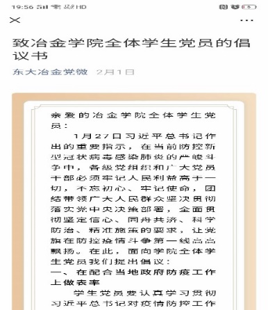 学院党委发布《致冶金学院各基层党组织、全体师生党员的倡议书》《致冶金学院全体学生党员的倡议书》,学院4个党总支、40个党支部、700余名党员迅速行动,用实际行动诠释初心和使命。每个教师及博士生党支部均面向本支部党员发布了一封信,号召师生勇于担当作为,切实发挥作用。