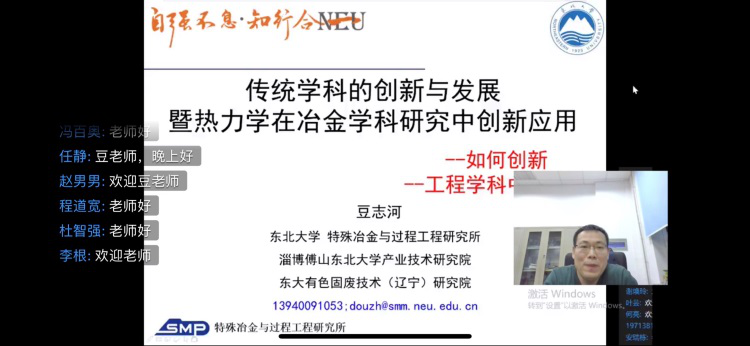 4月15日,冶金学院第一期“研师讲坛”系列线上学术讲座在钉钉平台以直播形式举行,活动由冶金学院研究生会主办,邀请冶金学院教授、博士生导师豆志河开展主题为“传统学科的创新与发展暨热力学在冶金学科研究中创新应用”的学术讲座,吸引了校内外相关学科师生近200人前来观看。