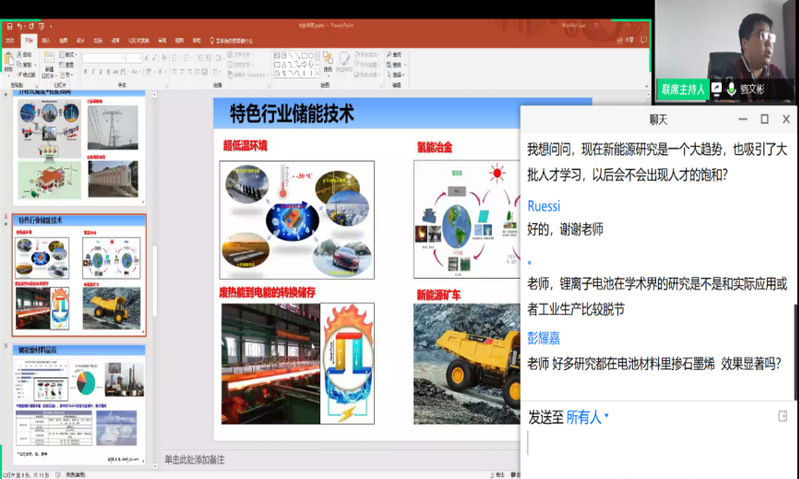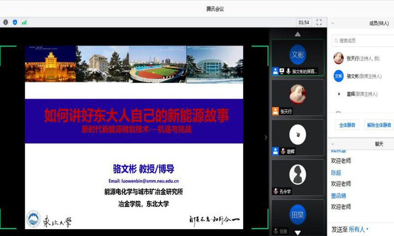 6月18日,冶金学院第二期“研师讲坛”学术讲座在腾讯会议平台以直播形式举行,冶金学院教授、博士生导师骆文彬应邀作主题为“如何讲好东大人自己的新能源故事”的学术讲座。活动由冶金学院研究生会主办,吸引了相关学科师生近200人前来观看。