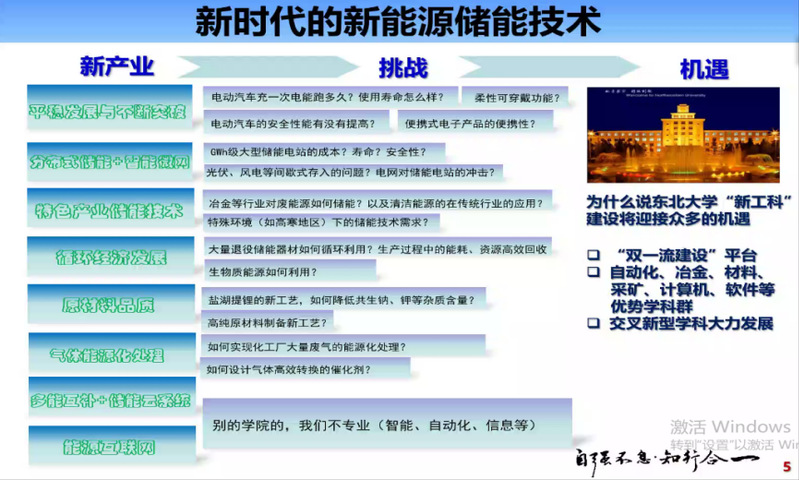 骆文彬从“新时代的新能源储能技术”“东北大学在新能源储能领域的机遇”“讲好东大人自己的新能源故事”等三个方面进行讲授。骆文彬从能源与环境对于生存与发展的影响出发,介绍了不同时期的能源革命,强调了“可循环性”对于新能源发展的决定性作用。骆文彬从新能源发展至关重要的原材料品质到循环经济发展等八个方面,介绍了新能源学科面临的挑战,以及各研究应对挑战所做出的一系列成果。骆文彬介绍了东北大学新能源领域发展的优势、系所设置和筹划的一系列战略布局,包括能源电化学与城市矿冶金研究所的成立与储能工程专业的筹办等举措。