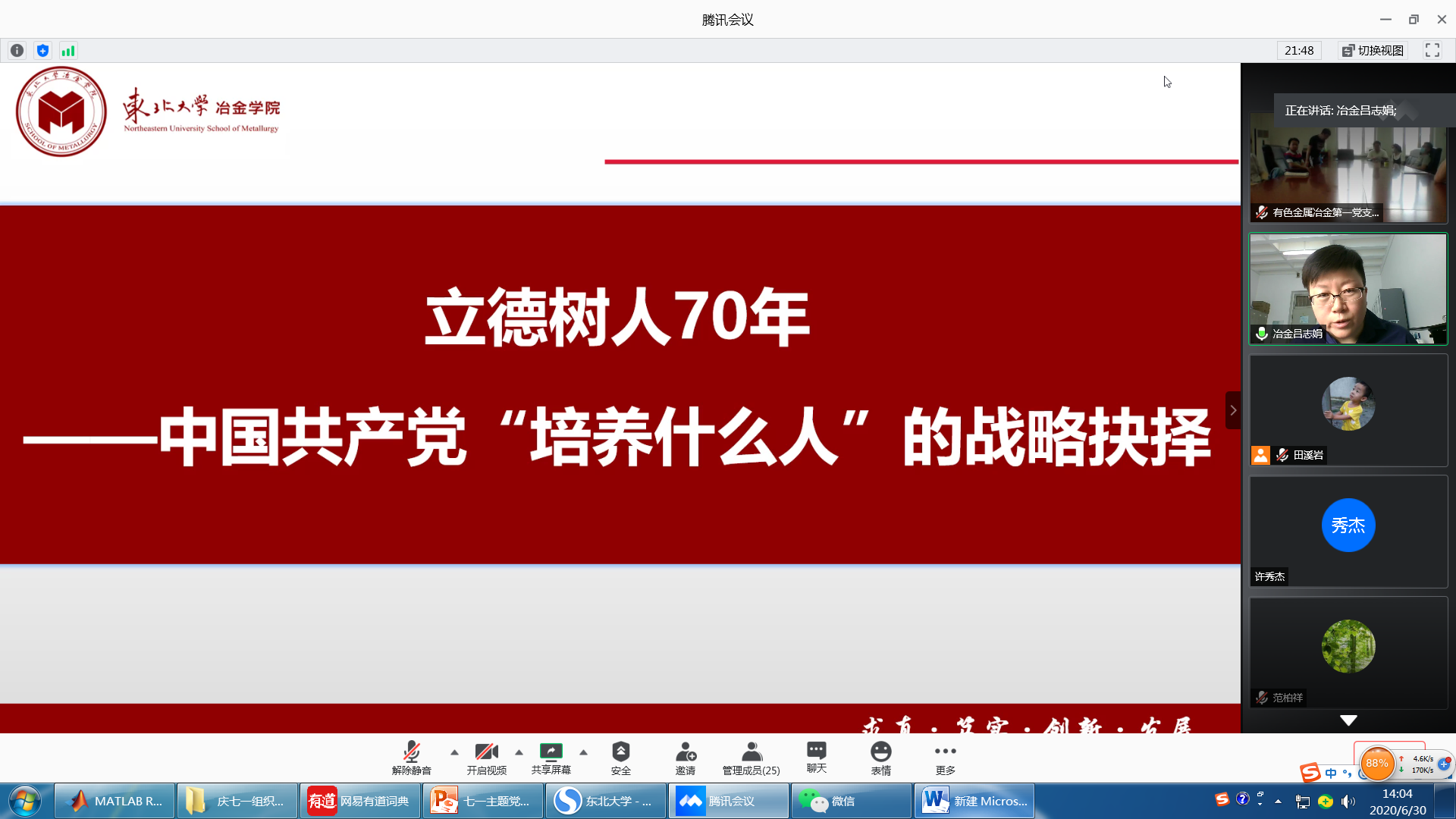 6月30日,为庆祝“七一”党的生日,教育部EPM重点实验室教工党支部与有色金属冶金第一党支部共同开展了线上“党课开讲啦”活动,邀请冶金学院党委副书记、副院长吕志娟为两个支部的师生党员讲授以“立德树人70年—中国共产党“培养什么人”的战略抉择”为主题的党课。