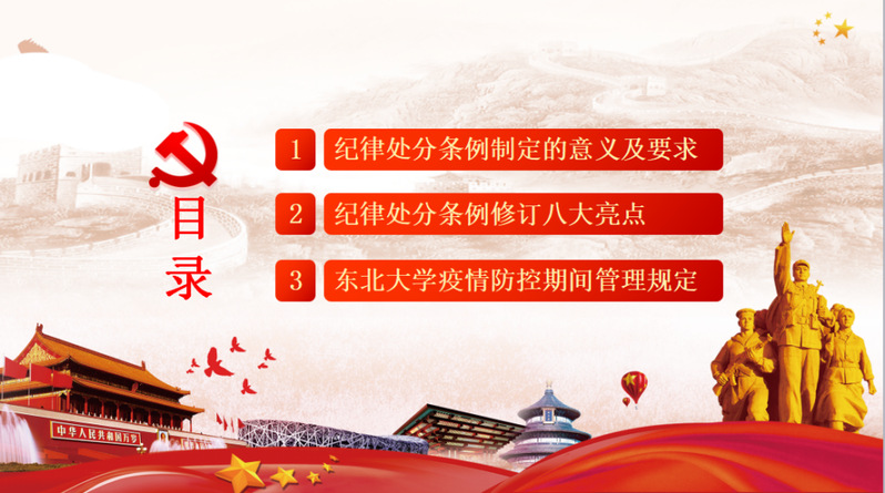 会上,梁宗宇同志分别从纪律处分条例制定的意义及要求、纪律处分条例修订八大亮点、东北大学疫情防控期间管理规定三部分对《中国共产党纪律处分条例》及《东北大学新冠肺炎疫情防控期间研究生管理暂行规定》进行了讲解。