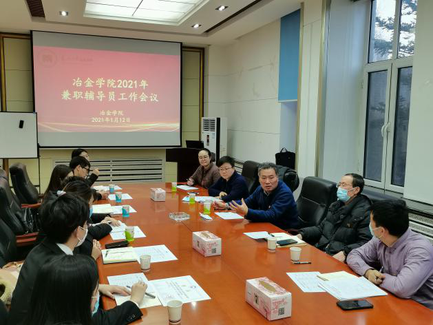 1月12日,冶金学院在冶金馆301会议室召开2021年兼职辅导员第一次工作会议。冶金学院党委书记杨东坪、党委副书记兼副院长吕志娟、党委组织员曹殿民、学院全体学生工作干部及9名兼职辅导员参加会议。会议由学生办副主任刘茵主持。