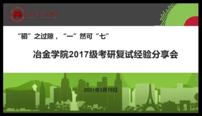 为帮助2017级考研学生更好地迎接复试,3月19日,冶金学院依托钉钉平台顺利召开“2017级考研复试经验分享会”。2017级本科生辅导员高山、梅馨予以及年级全体考研学生参加本次交流会。