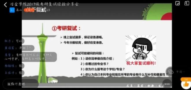 为帮助2017级考研学生更好地迎接复试,3月19日,冶金学院依托钉钉平台顺利召开“2017级考研复试经验分享会”。2017级本科生辅导员高山、梅馨予以及年级全体考研学生参加本次交流会。