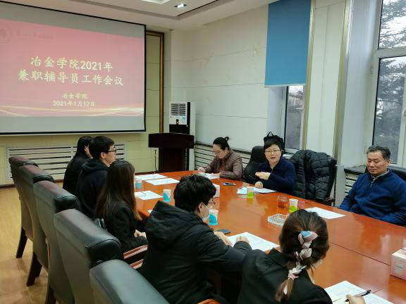 1月12日,冶金学院在冶金馆301会议室召开2021年兼职辅导员第一次工作会议。冶金学院党委书记杨东坪、党委副书记兼副院长吕志娟、党委组织员曹殿民、学院全体学生工作干部及9名兼职辅导员参加会议。会议由学生办副主任刘茵主持。