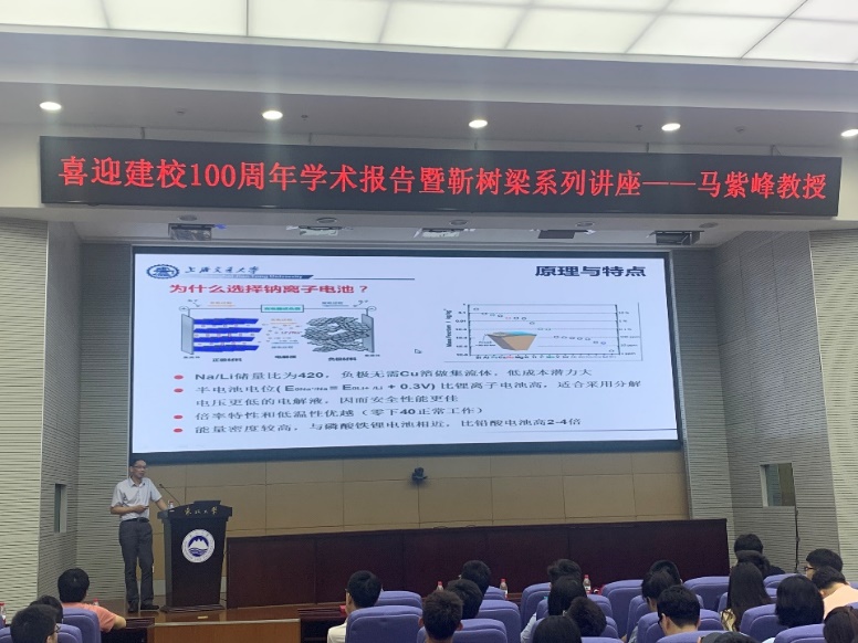 马紫峰以汽车动力系统的过去与未来切入,从锂离子电池的发展、动力电池的技术路线、钠离子电池的发展、钠离子电池的正负极材料等几个方面层层递进,以铁酸钠基钠离子电池正极材料为例,讲解了正极材料充放电过程中热稳定性与相变规律。同时为学院师生介绍了如何从实验室的科研成果向产业化发展,以及目前钠离子电池企业的基本概况。