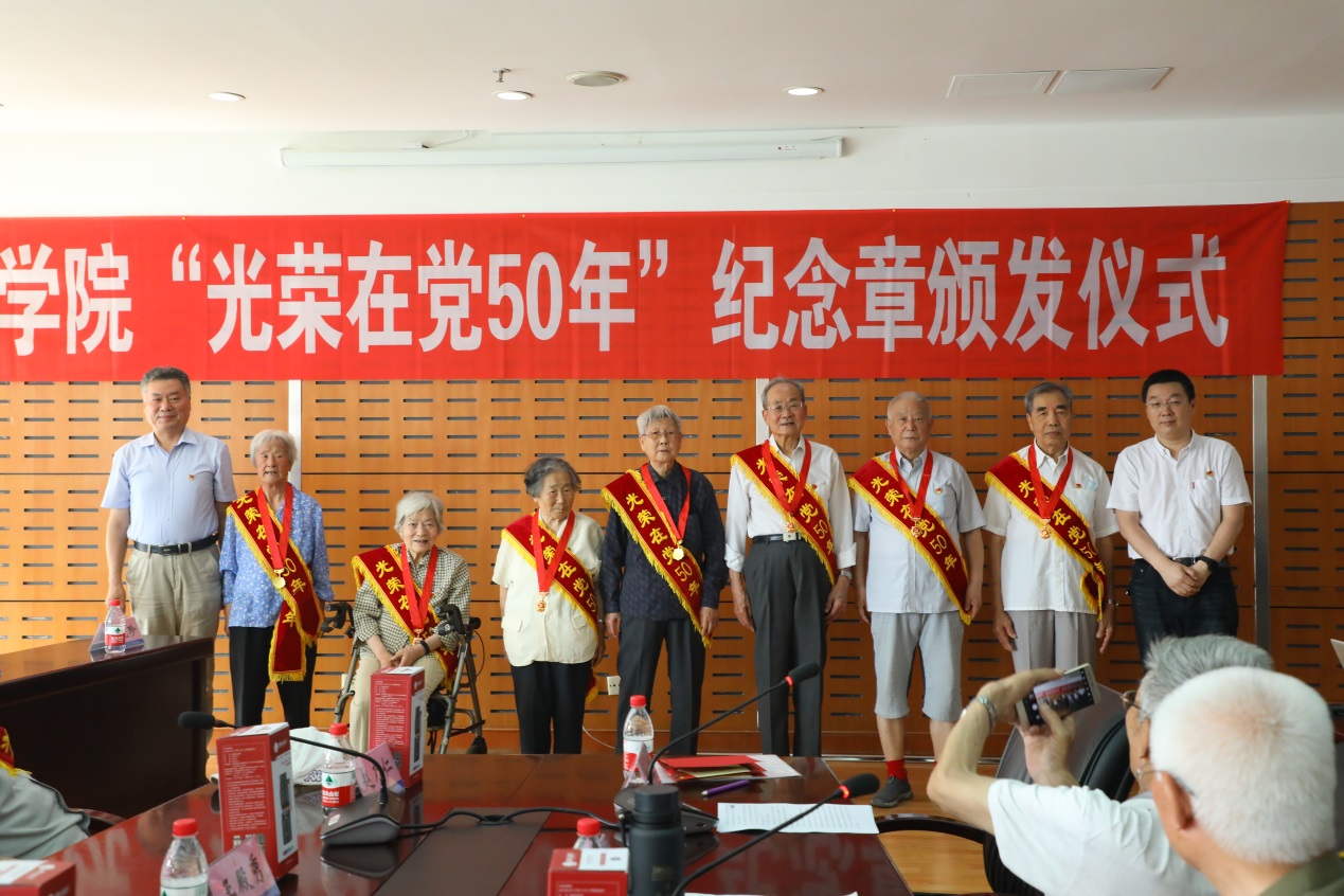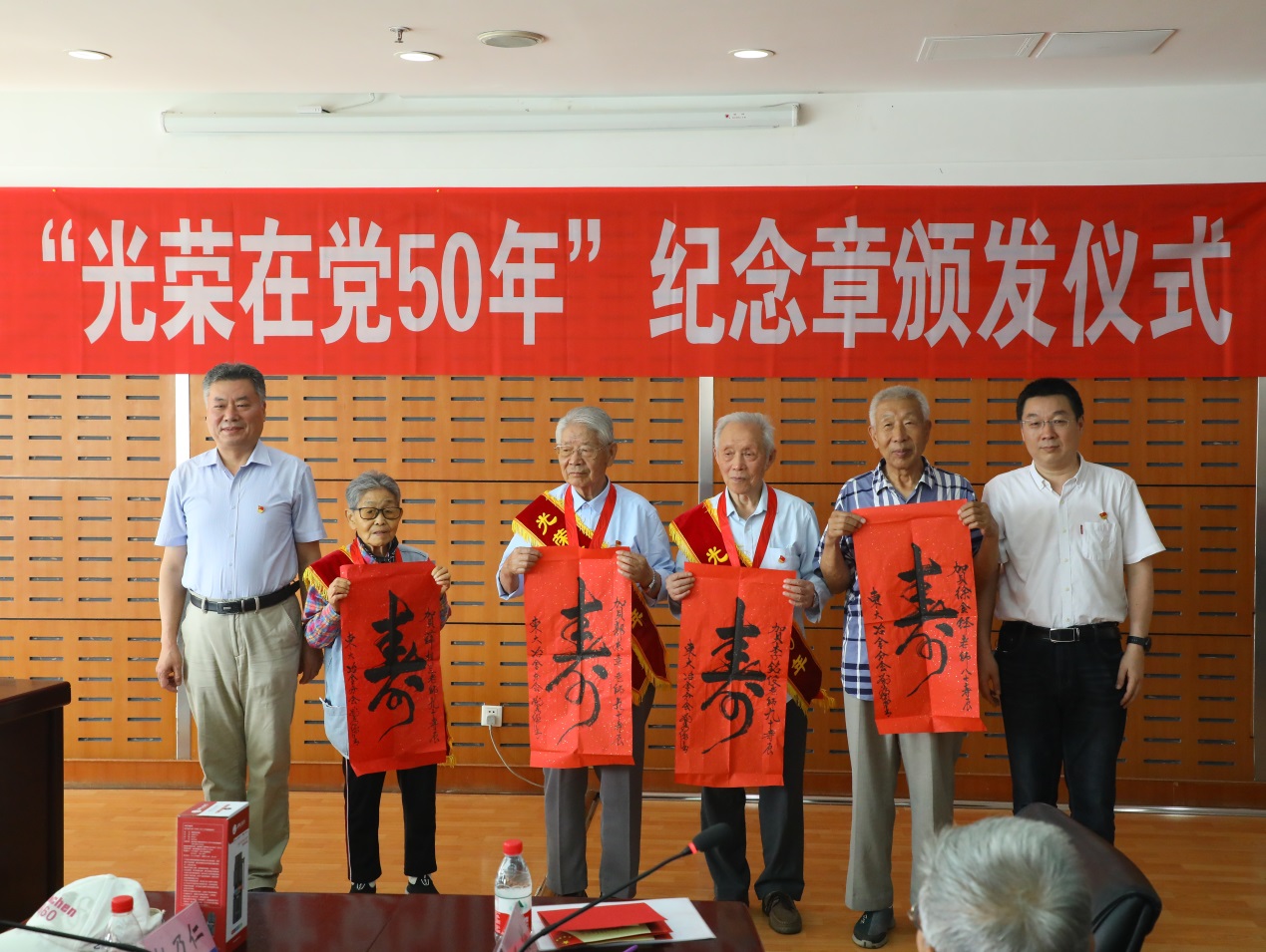 接下来,杨东坪、刘承军为老党员们颁发“光荣在党50年”纪念章,并向今年恰逢80、90寿辰的4位老师赠送刘秀儒老师的 “寿”字书法作品,一并送上学院及全体师生对老师们健康长寿的深切祝福。