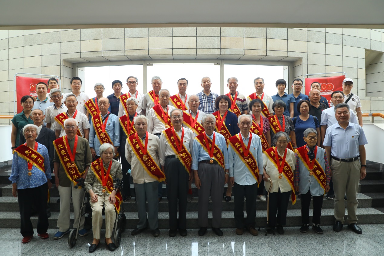 最后,由杨东坪领誓,与会的老党员们集体重温入党誓词。入党一生一次、在党一生一世。老党员们身披红色绶带,佩戴“光荣在党50年”纪念章,在重温入党誓词时声音依旧铿锵。会后,与会人员合影留念。