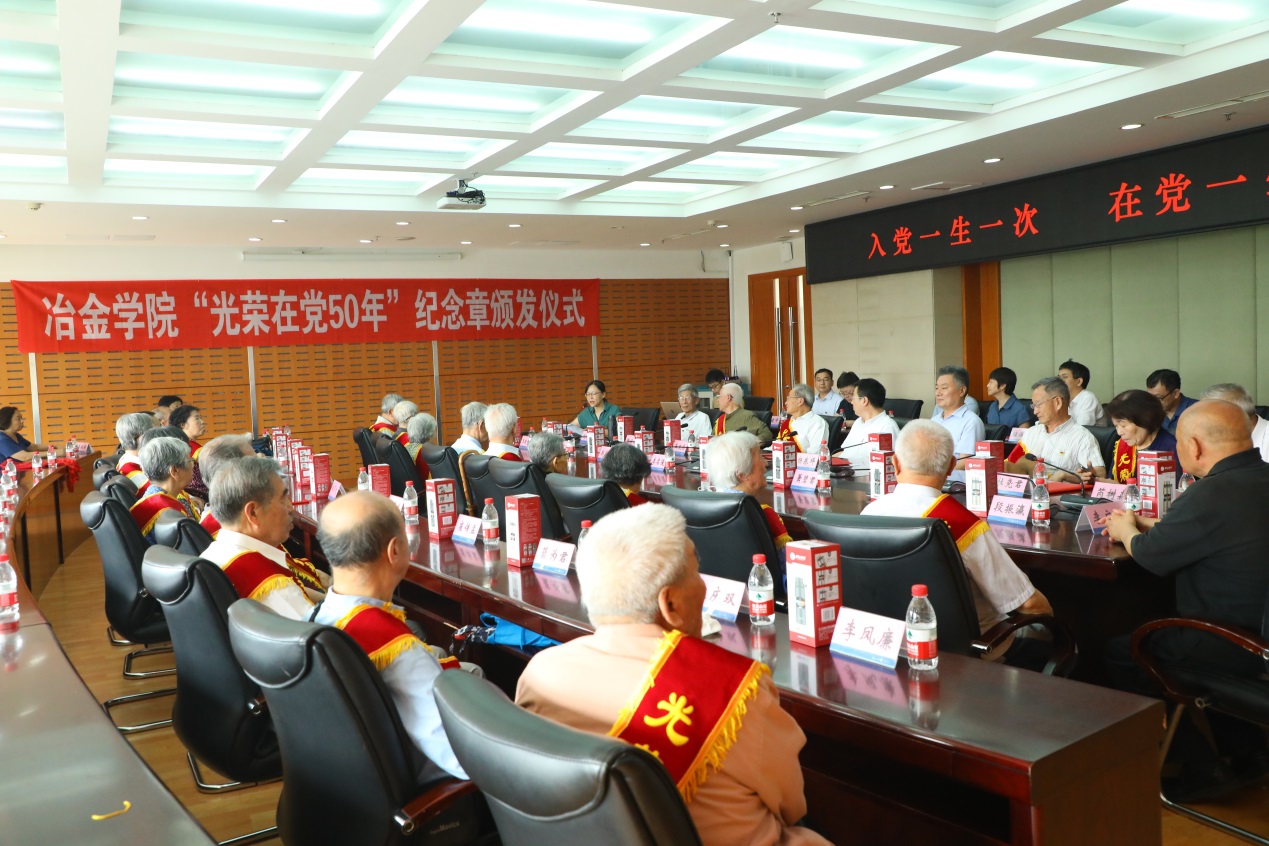 6月29日,冶金学院在汉卿会堂308会议室举行“光荣在党50年”纪念章颁发仪式。学院党委书记杨东坪、院长刘承军及全体领导班子成员,工会主席、系主任等教师代表,离退休冶金分会的负责老师等出席。25名获得“光荣在党50年”纪念章的老党员代表和80岁、90岁高龄的老同志们参加了仪式。仪式由副院长王梅主持。