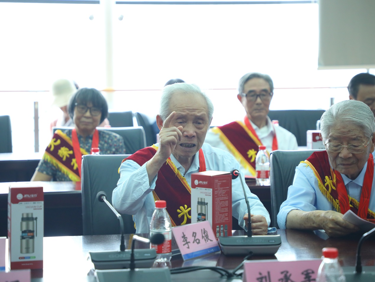 老党员们步入会场时,学院为他们佩戴上印有“光荣在党50年”红色绶带,庄重而热烈的仪式氛围由此开始。