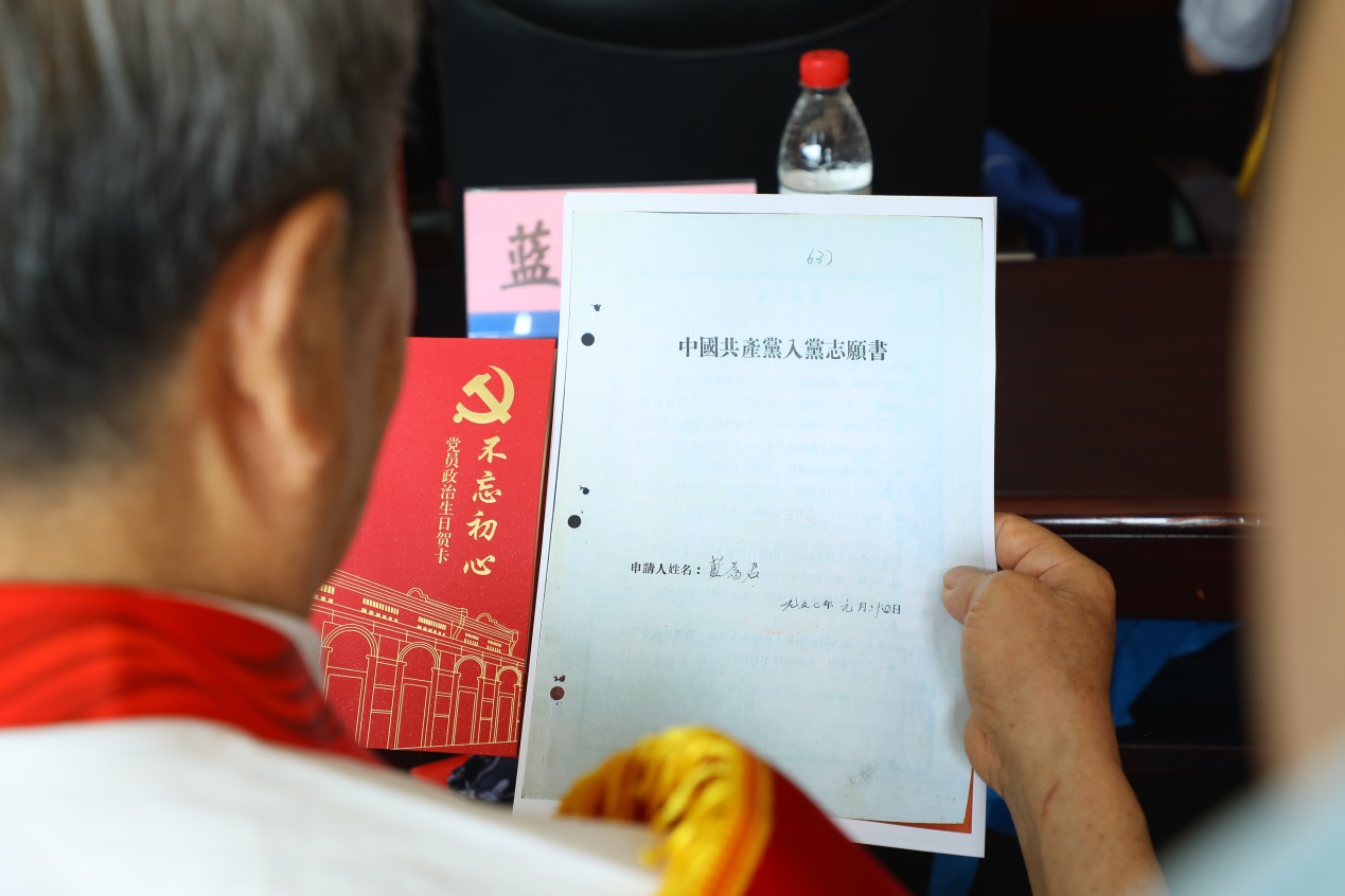 学院还为与会的老党员们准备了一份“特殊”的惊喜,那就是老党员们自己《入党志愿书》的影印件和一份定制的政治生日贺卡,由学院领导班子成员分别赠与与会的老党员们。他们抚摸着胸前的纪念章,看着年轻时亲笔写下的入党志愿书,激动的心情溢于言表,他们工作上虽然退休了,但党员的身份永远没有退休。