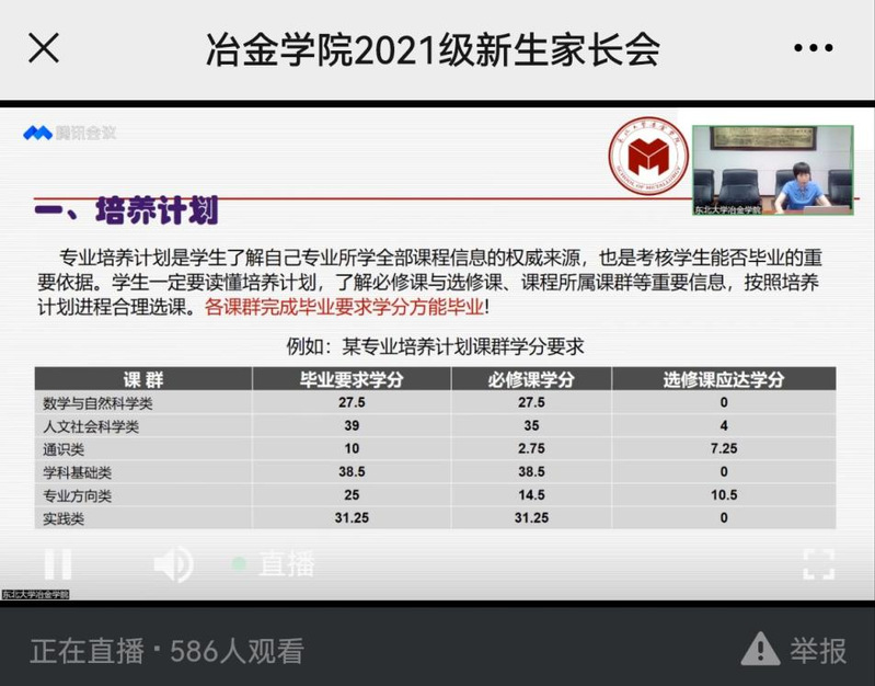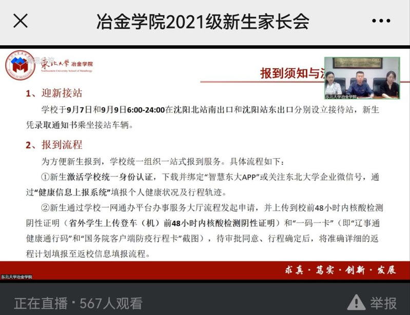 为进一步贯彻立德树人根本任务,架起家校协同桥梁,确保2021级新生在疫情防控期间安全、有序、顺利完成入学报到,冶金学院于9月5日召开线上新生家长会。冶金学院院长刘承军,副院长杜涛,党委副书记、副院长吕志娟,2021级本科生新生辅导员参加本次家长会,学生工作办公室主任赵冬颖主持会议。500余名新生家长通过网络直播实时参与到本次家长会中。
