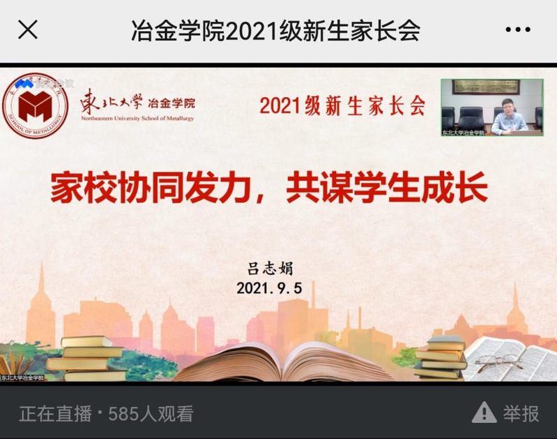 为进一步贯彻立德树人根本任务,架起家校协同桥梁,确保2021级新生在疫情防控期间安全、有序、顺利完成入学报到,冶金学院于9月5日召开线上新生家长会。冶金学院院长刘承军,副院长杜涛,党委副书记、副院长吕志娟,2021级本科生新生辅导员参加本次家长会,学生工作办公室主任赵冬颖主持会议。500余名新生家长通过网络直播实时参与到本次家长会中。