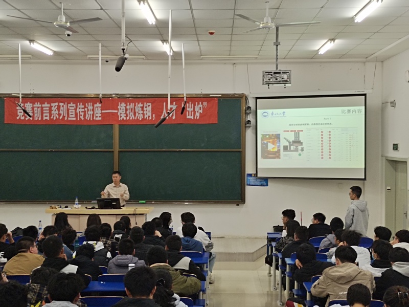 10月27日14时,冶金学院竞赛前“言”系列讲座第一期--“模拟炼钢,人才‘出炉’”在大成教学馆101室举办。冶金学院特殊钢冶金研究所战东平教授受邀作为主讲人,冶金学院党委副书记兼副院长吕志娟,学生工作干部以及150余名同学参加本次讲座。