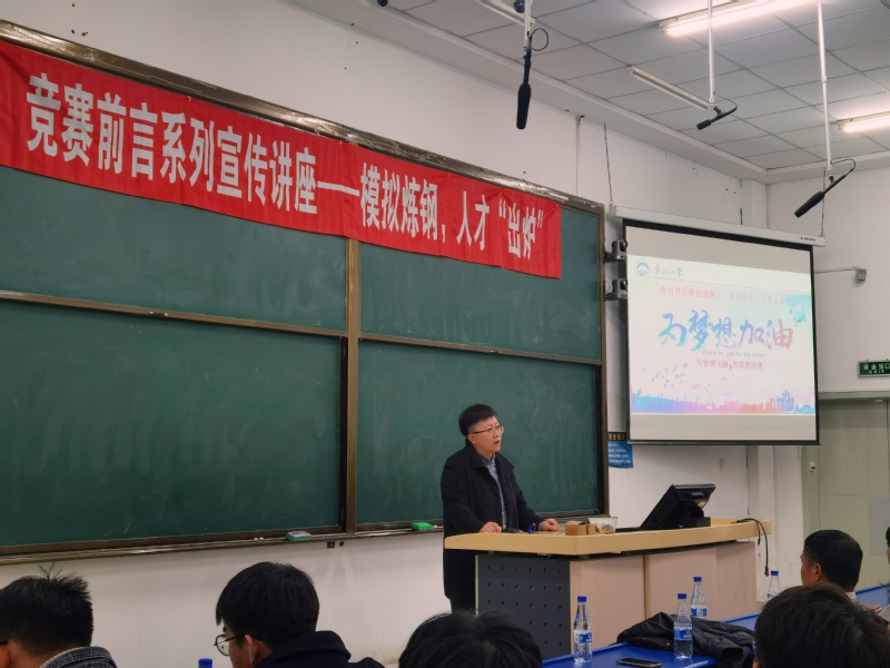 报告伊始,战东平教授首先从学业规划方向、就业、升学、出国等四个方面,与同学们分享了为什么要参加科技竞赛。他以企业实际案例为例,强调新型基础设施建设支撑钢铁工业智能制造,希望大家能够积极参与数字化炼钢赛事,如世界模拟炼钢挑战赛、全国大学生冶金科技竞赛等。他详细介绍了本次世界模拟炼钢挑战赛的赛程和比赛方式,以及之后培训、考核及校内比赛的相关事宜。