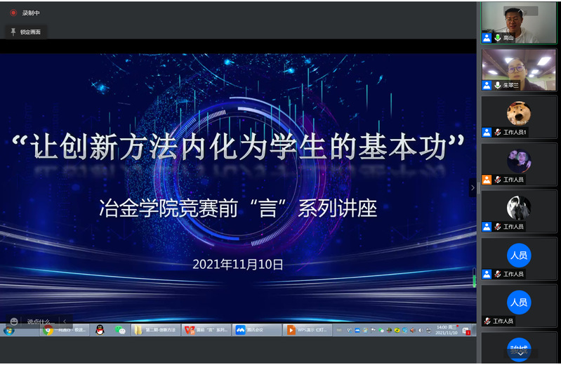 11月10日14时,冶金学院竞赛前“言”系列讲座第二期——“创在冶金,新在竞赛”于线上举办。东北大学创新创业学院项目部部长兼办公室主任朱翠兰老师受邀作为主讲人,学院一百余名同学参会,讲座由冶金学院本科生辅导员高山主持。
