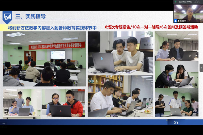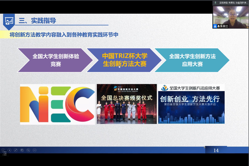 朱翠兰老师以“让创新方法内化为学生的基本功”为题,从理论课程、实践指导、建设成效等三个方面向同学们介绍了关于创新方法的相关课程、具体赛程以及竞赛培训等相关内容。她结合实际工作经验,详细讲解了学校如何以完善的体系构建让创新方法融入到教学中,并结合全国大学生创新体验竞赛、中国TRIZ杯创新方法大赛、全国大学生创新方法应用大赛三项东北大学星级竞赛,向同学们介绍如何将创新方法教学内容融入到教育实践环节。她以学习观念转变的实例告诫同学们,在知识经济时代,只有终身学习才能跟上时代的步伐,只有让创新方法深入到学习和生活中,才能高效地取得成果。最后,朱翠兰老师鼓励同学们将创新方法与所学专业相结合,积极参与到创新方法大赛等多项科技竞赛中,以科技竞赛为载体,逐步增强科技创新能力。