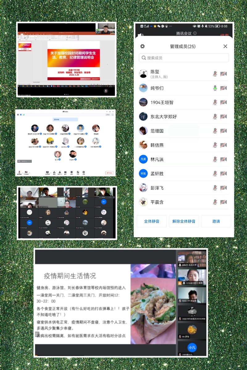 班会中,班导师梳理了校园封闭管理期间的日常管理要求,重点对每日健康信息上报、流调排查、核酸检测、外出审批流程、生病就诊等要求做了详细说明。班导师向学生与家长传达了线上教学及考试的相关安排,并对大家提出的问题进行了解答。班导师从人文关怀角度叮嘱学生的同时,请家长放心,学校、学院将尽全力确保学生的健康安全和学习生活稳定。