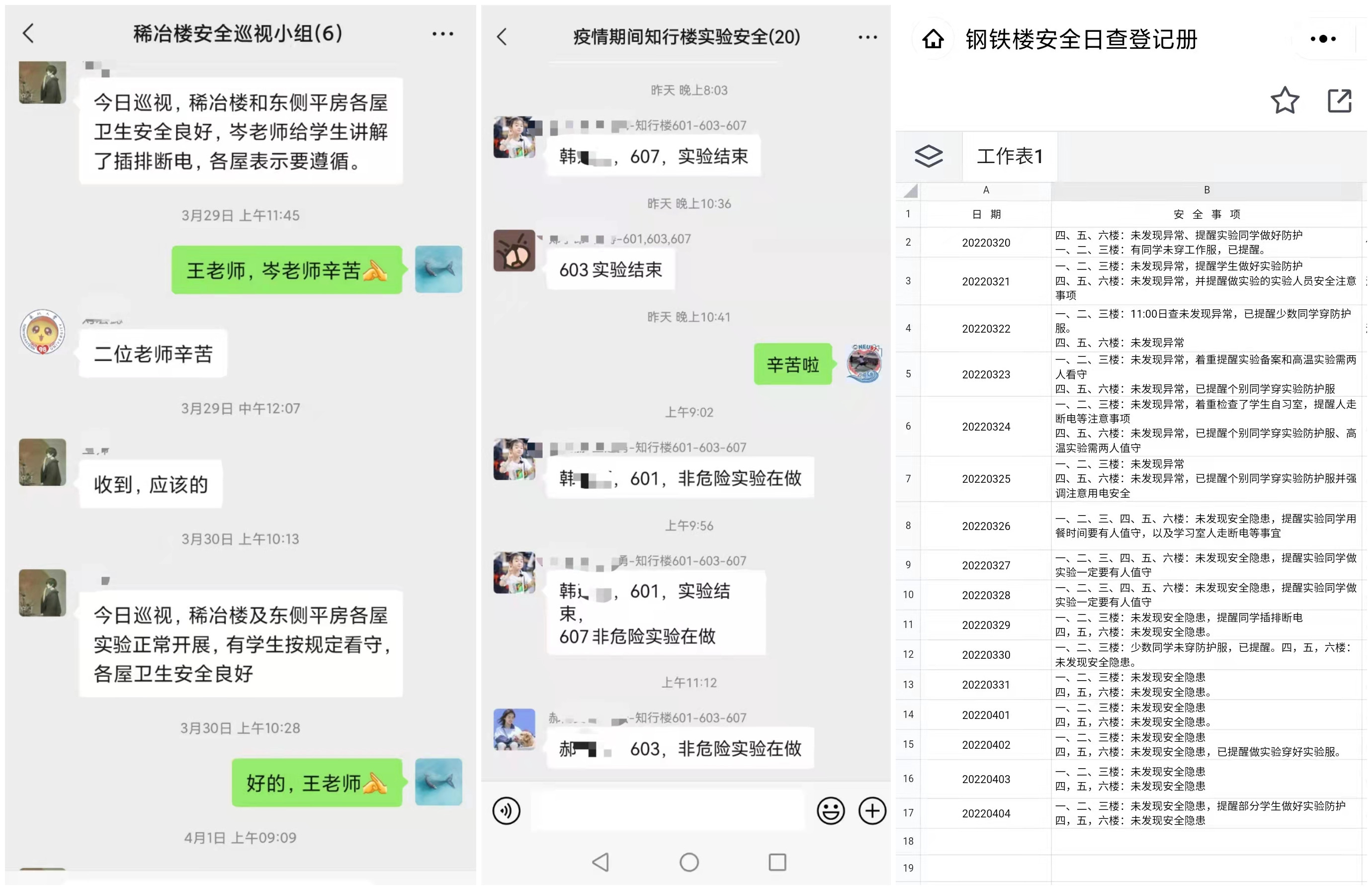 学院办公室、教学科研办公室留校教工葛启桢、刘宏懿,全天候坚守在学院办公区,保障学院教师线上教学顺利进行、科研立项财务报销等有序开展,保证为全院师生提供管理服务不中断,并为留校教职工的生活提供必要的后勤保障。同时,负责协调实验室安全日查工作,按时汇总实验室巡查小组日报,及时处理特殊问题和突发情况,每天晚上巡查冶金馆、钢铁楼、稀冶楼、知行楼等全部实验室,强化安全保障,确保疫情防控期间学院的实验室安全。