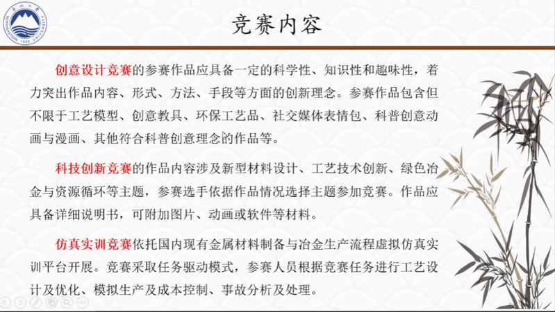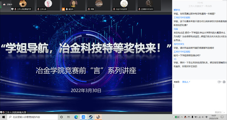 3月31日,冶金学院学生科学技术协会竞赛前“言”系列讲座第三期——“学姐导航,冶金科技特等奖快来!”于线上开展。讲座由冶金工程专业2021届本科毕业生董玉凤主讲,指导老师高山及一百余名同学参加。