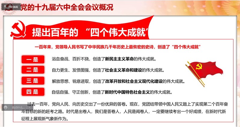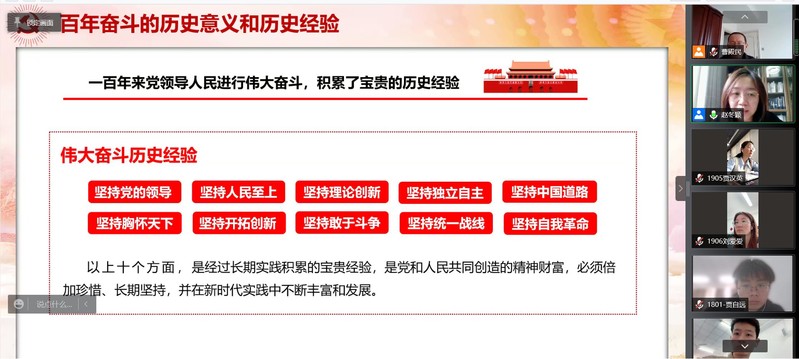 赵冬颖老师强调党的十九届六中全会是在重要历史关头召开的一次具有重大历史意义的会议,开创性提出了“两个确立”,全局性概括了“十个坚持”,作为中国共产党第三个历史决议,对新时代党和国家事业发展、对推进中华民族伟大复兴历史进程具有决定性意义。同时,赵老师指出决议中的自我革命是一针见血的,彰显了百年大党勇于自我革命的高度自觉,体现了共产党人坚持党要管党、全面从严治党的坚定决心。