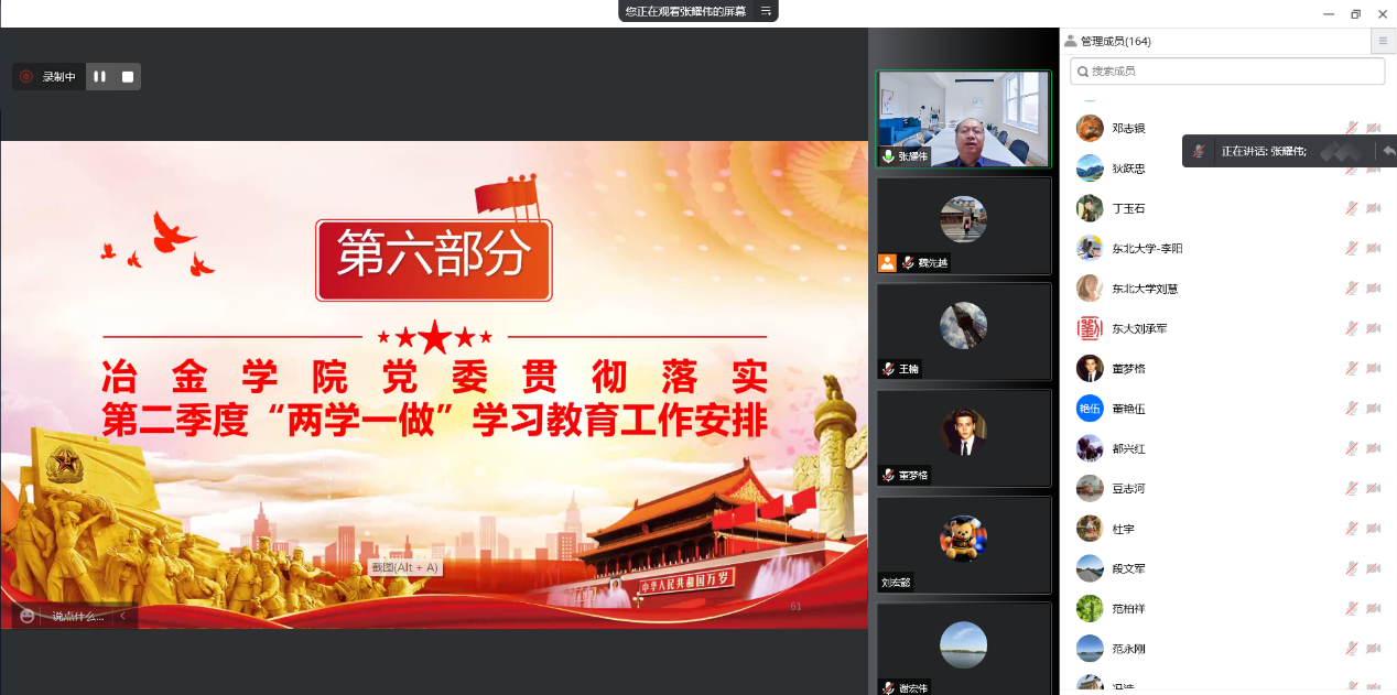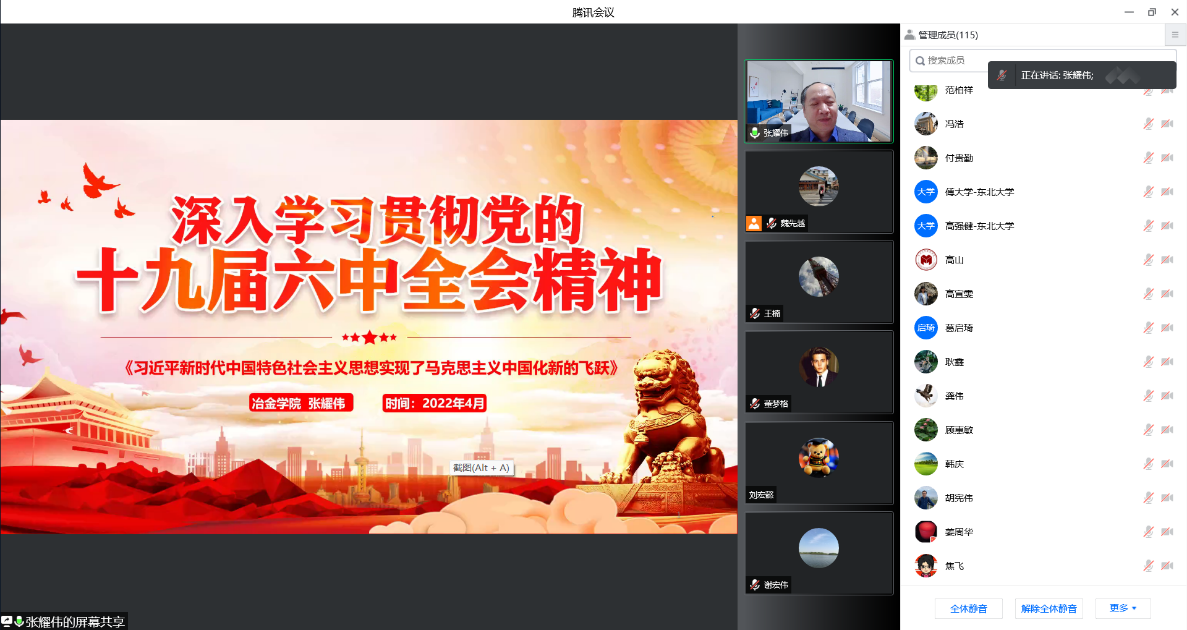 4月19日,冶金学院党委党校通过腾讯会议平台开展教工党员专题培训,由学院党委书记张耀伟讲党的十九届六中全会精神专题党课,学院党委160余名教工党员参加学习。