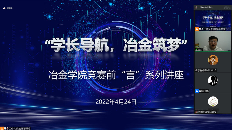 近日,冶金学院“竞赛前‘言’第四期冶金科技青年说——学长导航,冶金筑梦”主题讲座于线上顺利举办。学院百余名备赛学生参加,指导老师高山参会。