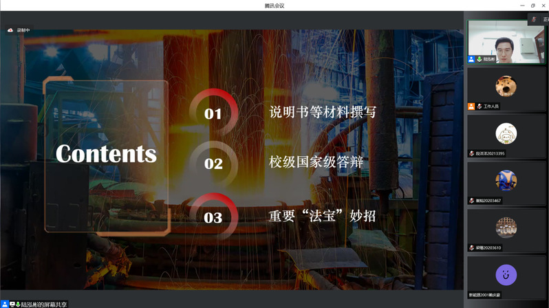 讲座伊始,陆泓彬学长根据自己参赛经验,由三方面详细的向同学们讲述了撰写完善说明书的详细流程,从内容、格式、细节等方面一一阐述,倾囊相授。紧接着,陆泓彬学长向同学们分享了自己在答辩准备方面的经验,并根据自己在比赛过程中遇到的问题以及同学们对答辩环节的几大困惑,从学术PPT、外部硬件设施、和团队介绍等三个方面给同学们指点迷津。最后,陆泓彬学长在对于评委提问环节的要点和小技巧向同学们传授了自己的一些见解和“小妙招”。讲座最后,同学们根据自身情况和学长进行了积极的沟通,学长一一解答并提出建议。陆泓彬学长也祝愿同学们能够在即将到来的冶金科技竞赛中取得优异成绩。