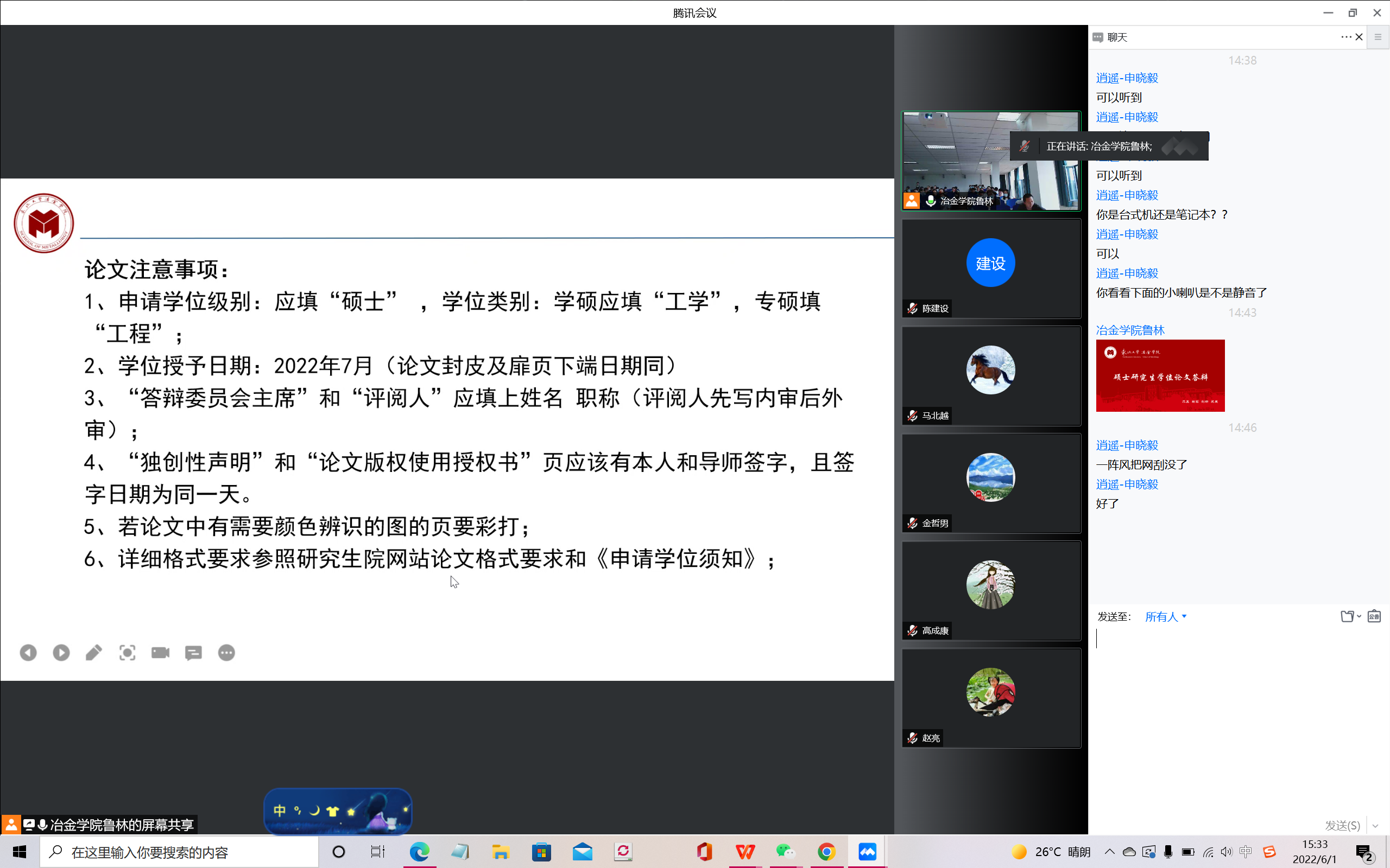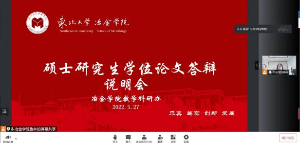 为了让学生更好地了解此次答辩的具体流程和要求,冶金学院教学办于5月27日面向全体硕士毕业生线上召开了“硕士研究生学位论文答辩说明会”,详细地讲解答辩前准备工作、答辩流程、答辩后材料的上交以及注意事项。