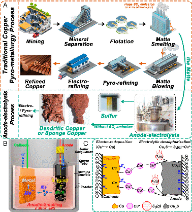 图1. a. 传统硫化物冶炼及阳极电解流程示意图,b. 阳极电解装置示意图,c. 阳极电解原理示意图。